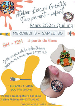 Les ateliers parents-enfants en loisirs créatifs ne sont plus proposés de manière autonome. Je suis actuellement à la recherche d'une collaboration avec une MJC ou un centre social pour pouvoir organiser ces ateliers dans un cadre collectif. Restez connectés pour plus d'infos à venir !